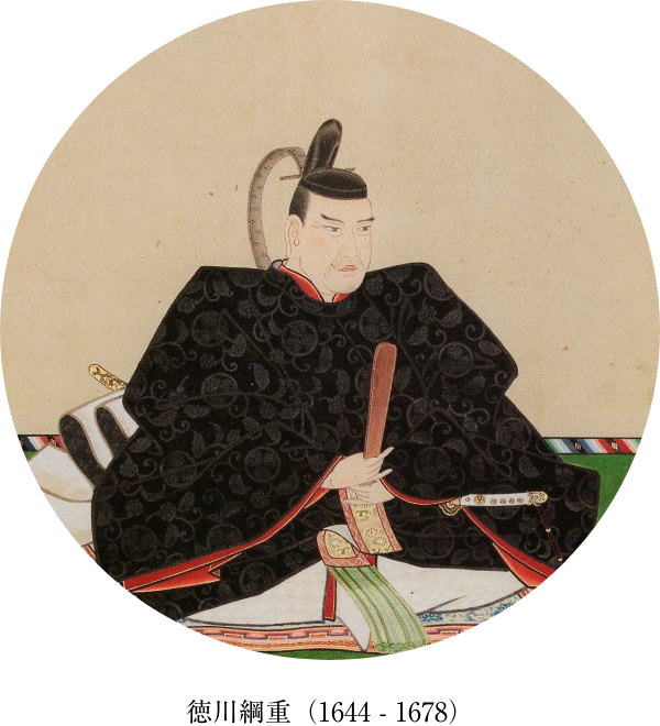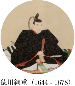 徳川家康のひ孫「徳川綱重」は江戸時代初期の大名で、徳川幕府第二代将軍・秀忠の孫、第三代将軍・家光の子、第四代将軍・家綱の弟、第五代将軍・綱吉の兄、第六代将軍・家宣の父、第七代将軍・家継の祖父にあたります。甲府藩主として甲斐国を治め、別邸として建設した「甲府浜屋敷(甲府範下屋敷)」は、現在浜離宮恩賜庭園となっています。延宝六年(1878年)逝去後、宝永七年(1710年)に「贈正一位太政大臣征夷大将軍」に任じられ、亡くなった後に「征夷大将軍」が送られています。